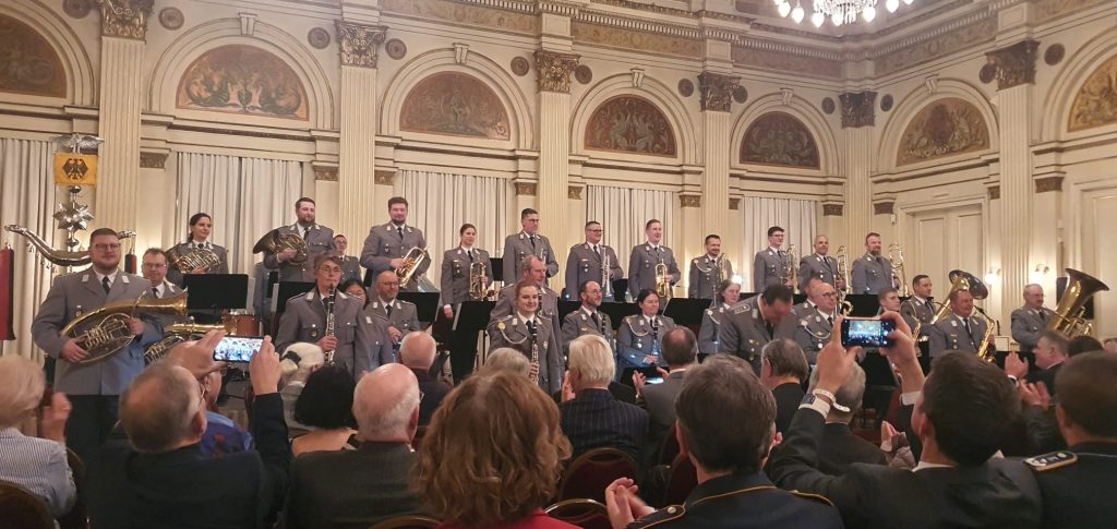 Die Bundeswehr ist vielfach Thema in der Tagespresse. Jedoch spielt dabei selten ein Musikkonzert der Truppe die erste Geige. Ganz anders war das für Heike Lang, Michael Hirschle und dem Vorsitzenden der SG Anspach Ferdinand Hnatkow am Mittwochabend der Fall. Sie alle waren nämlich Teil der Zuhörerschaft, die das große Vergnügen hatten, einer Kammermusikbesetzung sowie einer Orchesterbesetzung des Heeresmusikkorps Kassel in der Landeshauptstadt Wiesbaden zu lauschen. 70 Jahre ist die Bundeswehr nun alt. Für diesen Anlass hat das Ensemble unter der Leitung von Hauptmann Schiffers ein breites Repertoire von jüngeren wie auch älteren Sounds zusammengestellt und dem gefüllten wie auch prunkvollen Saal der Casino Gesellschaft in Wiesbaden zum besten gegeben. Dabei trafen an diesem Abend Ludwig van Beethoven auf John Kander – er ist der Komponist der Musik zu „New York, New York“ – oder aber 80er Kult Songs wie „Ohne dich schlaf ich heut Nacht nicht ein“ auf traditionelle Marschlieder wie der „Moselmarsch“ oder „Kein schöner Land“. Flott im Tempo, akzentuiert in dem richtigen Moment und unterhaltsam besonders in den Zwischenmoderationen glänzten die Musikerinnen und Musiker im Dienstanzug in grau.