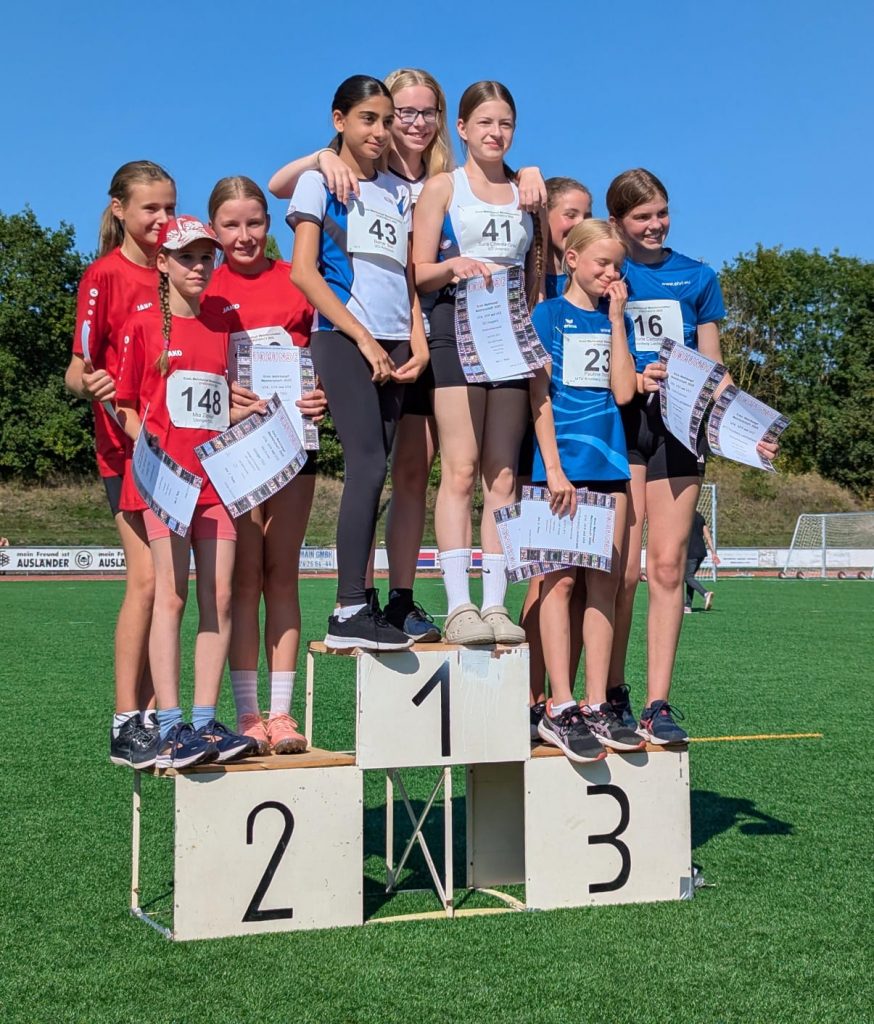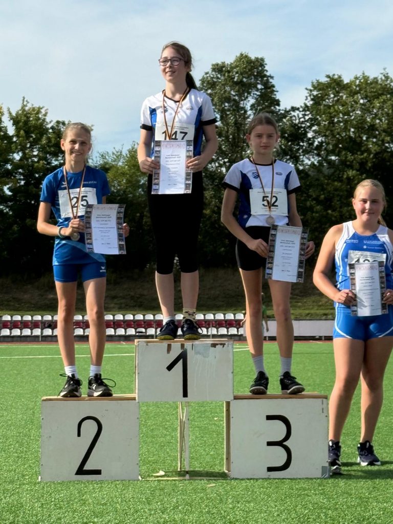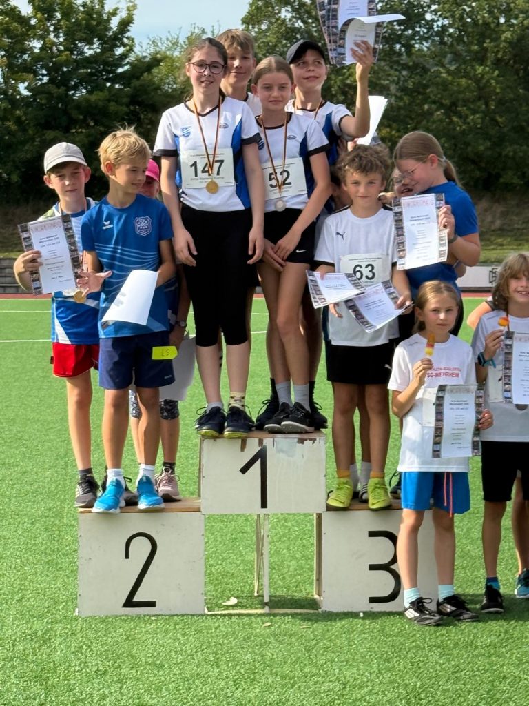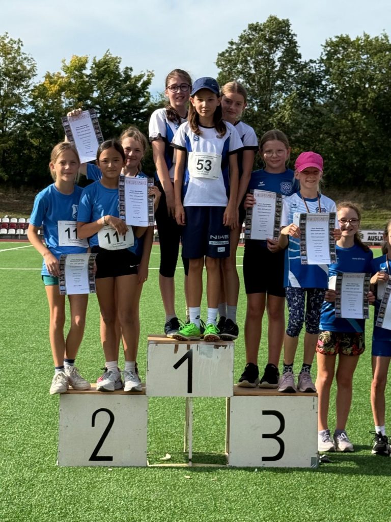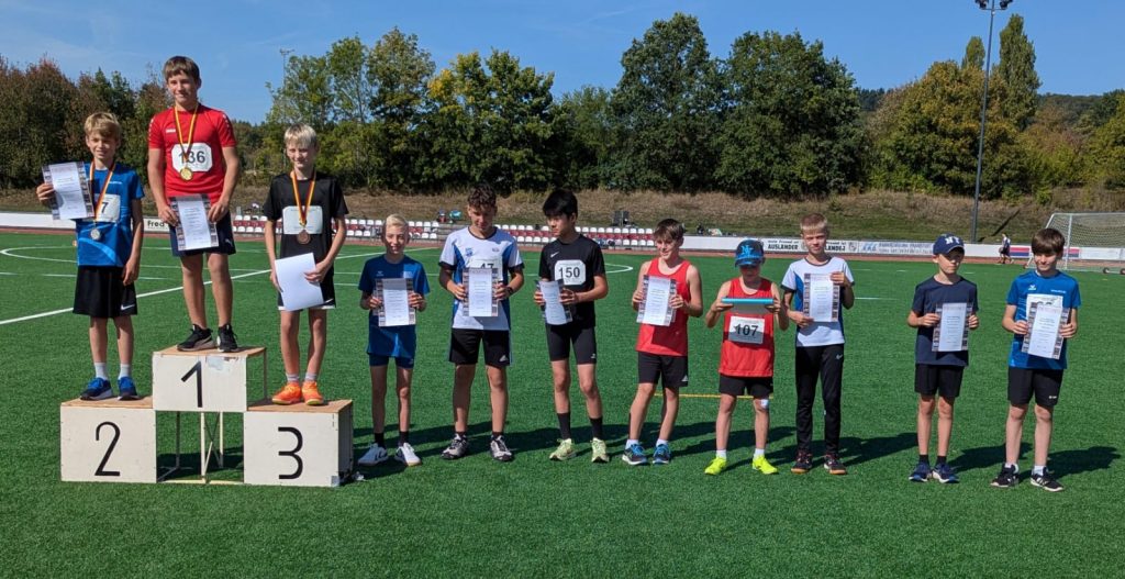 Sophia und Maja bei der Siegerehrung Olivia gewinnt die Goldmedaille Bene und Moritz bei der Siegerehrung M12 Dreikampf Boris gewinnt die Silbermedaille Sara und Bahar bei der Siegerehrung Lukas allein auf weiter Flur Fünffachsieg in der W14 Johanna gewinnt den Vierkampf Lilli in der W15 Dreikampf ganz oben Gold und Bronze für Carlotta und Charlotte im Vierkampf Julian und Johan bei der Siegerehrung der M15 im Dreikampf Neo gewinnt im Vierkampf der M14 Gold Gold und Bronze in der Staffel U14 Gold in der Staffel U14 Platz in der Mannschaftswertung WU14 1. und 2. Platz in der Mannschaftswertung U16 (mit Trainer) 1. Platz in der Mannschaftswertung WU16 VierkampfJonas und Henry bei der Siegerehrung M11Anna und Luise bei der Siegerehrung W11Siegerehrung Mannschaftswertung W11Siegerehrung Staffel U12Siegerehrung Mannschaft M11