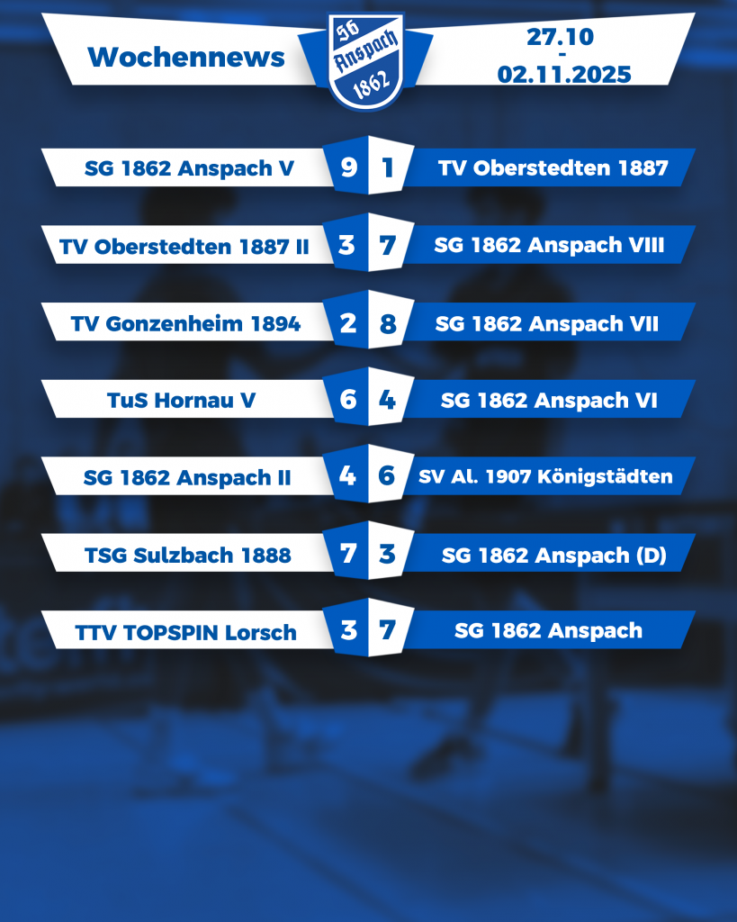 Die vergangene Woche war für die Teams der SG 1862 Anspach erneut geprägt von zahlreichen spannenden Begegnungen in den verschiedenen Ligen. Mit insgesamt sieben Spielen zwischen Dienstag und Samstag konnten sowohl deutliche Siege als auch knappe Niederlagen verzeichnet werden.