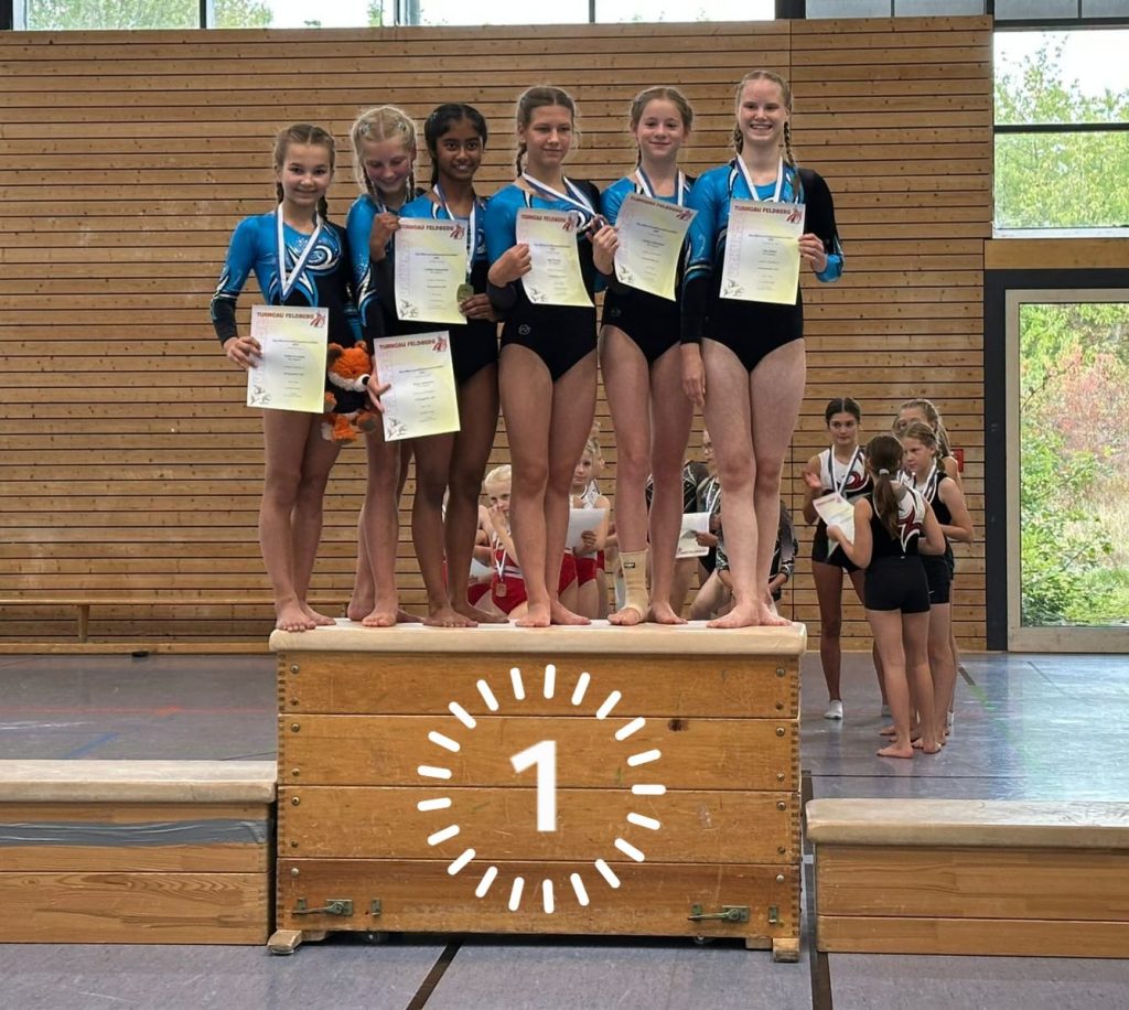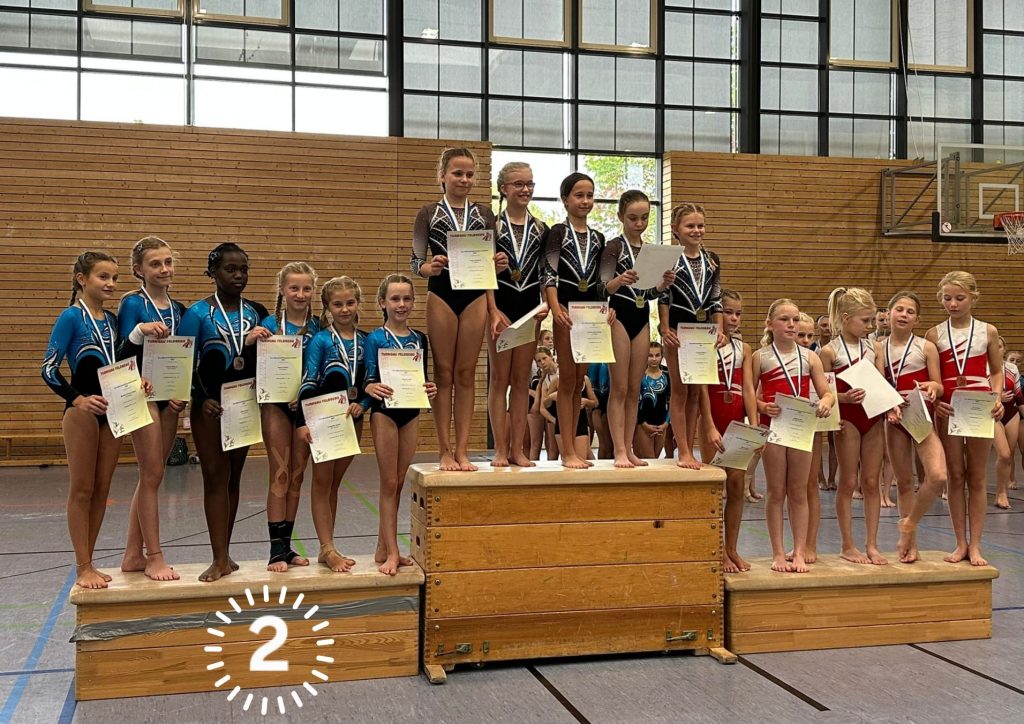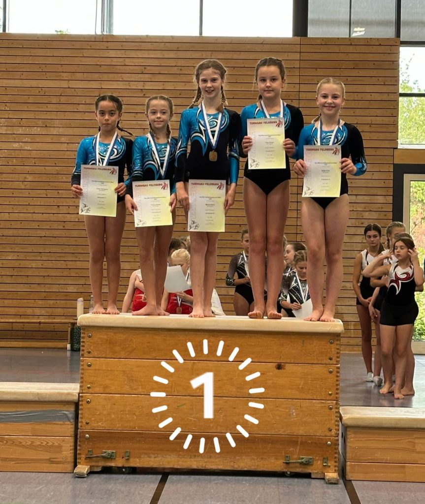 Emma Kahlert, Marlena Cintron Reiser, Katharina Busch, Mariella Wolf, Gloria Fonou und Emely Moses turnten einen erfolgreichen Wettkampf mit 155,05 Punkten und erreichten so den 2. Platz. Sie qualifizierten sich damit für die Bezirksmeisterschaften, die am 28.09.2025 in Wiesbaden ausgetragen wurden.