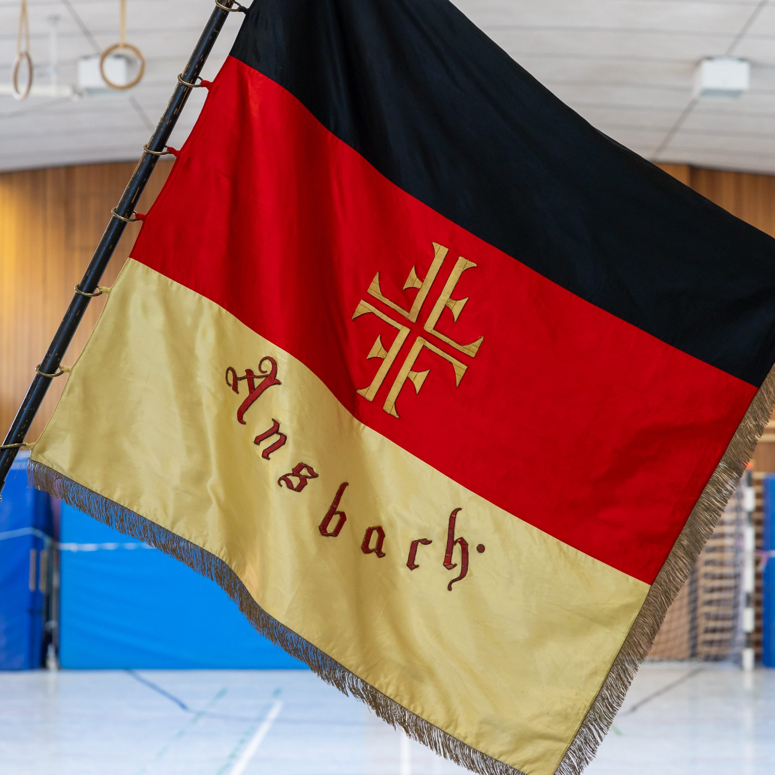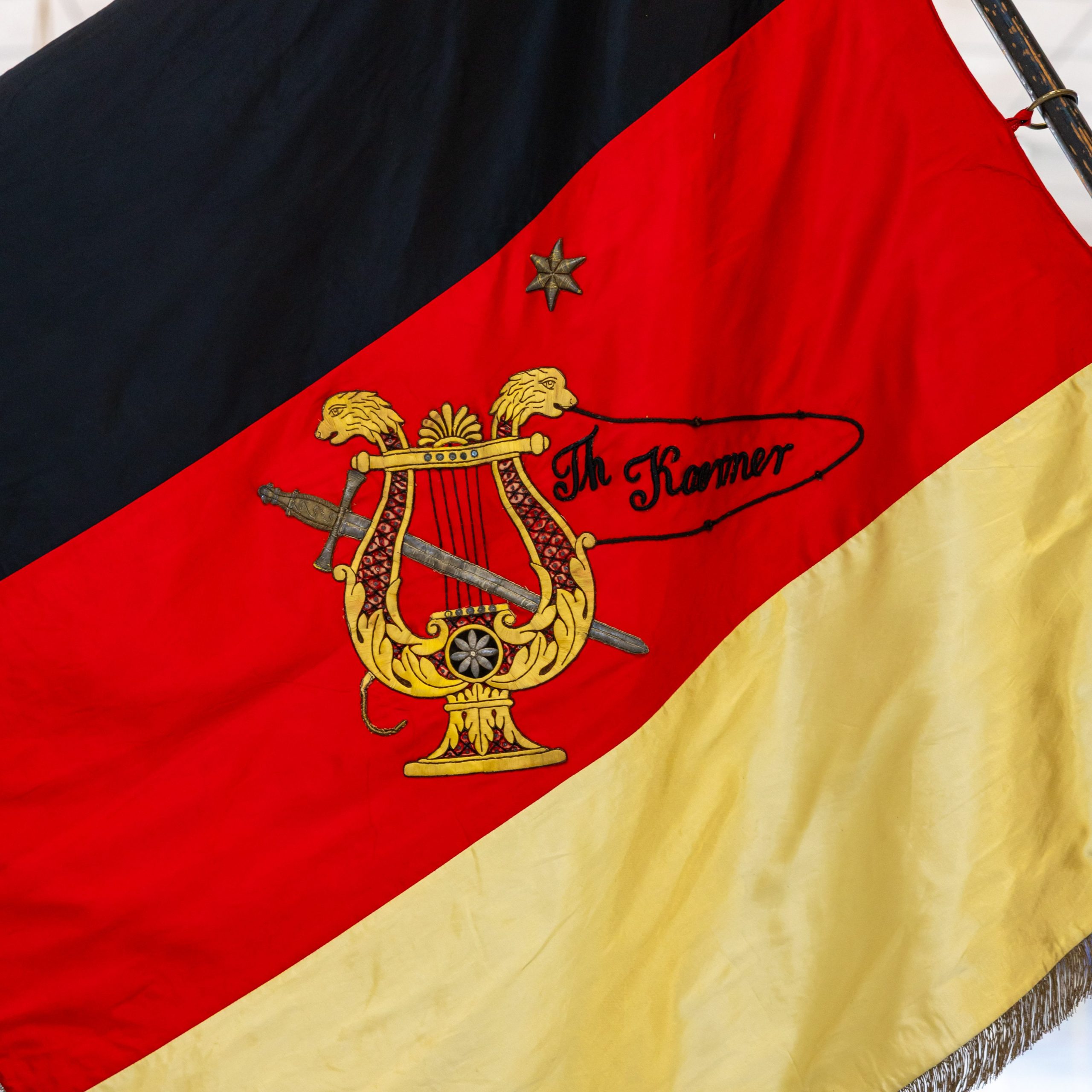 Wenn es um Kostbarkeiten geht, dann ist diese Fahne die wohl älteste Rarität in Neu-Anspach. Die Alte Fahne stammt aus den Gründerjahren der heutigen SGA. Vorgänger der SGA ist der Turnverein Anspach oder auch genannt „Turn- und Gesangsverein Theodor Körner“. Auf der Vorderseite befindet sich eine Lyra in dessen Tragegurt der Name „TH Körner“ geschrieben ist. Eine Lyra an deren Rücken ein Schwert lehnt ist eine Symbolik aus der Zeit der Lützow´scher Freikorps. Es ist eine Zeit, in der mehr Bürgerrechte gegen Napoleon im wahrsten Sinne des Wortes erkämpft werden sollten. Der Dichter Theodor Körner war einer der bekanntesten Mitglieder des Freikorps. Ob der Stern eine Bedeutung hat ist nicht bekannt. Er könnte jedoch eine Anspielung sein an das Gedicht „Der Morgenstern“, welches aus der Textsammlung „Knospen“ von Körner stammt.